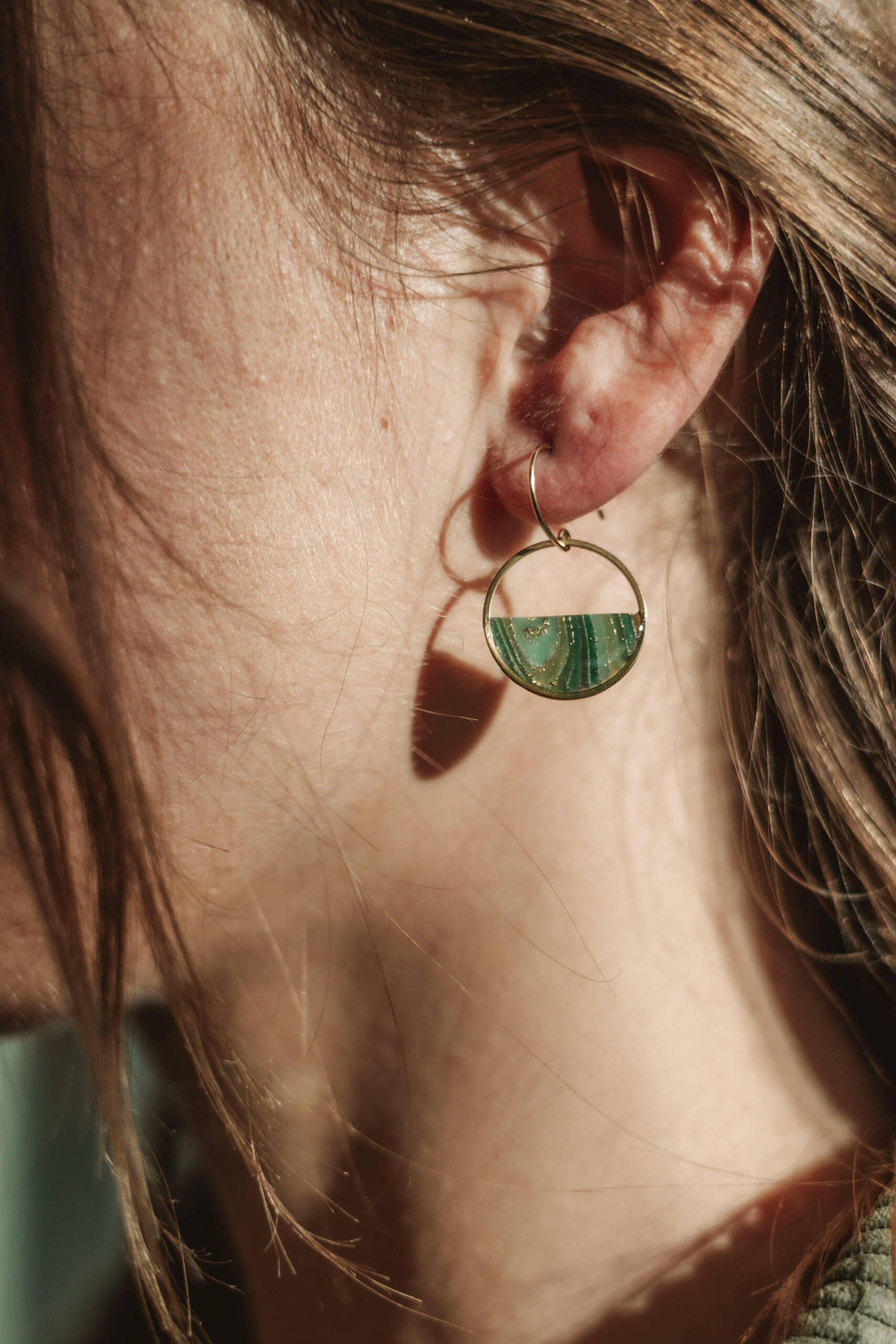 Basée dans le Gard, je fabrique tout moi-même dans mon atelier. Chaque création prend vie à partir de la matière brute : moulage, ponçage, découpe et finitions, tout est réalisé à la main avec soin et patience. De mars à septembre, je parcours les routes du Sud de la France et de la Bretagne pour vendre sur les marchés, au plus près des gens et des paysages qui inspirent mon travail. La nature, le ciel et même les tissus qui m’entourent influencent mes palettes de couleurs, une balade suffit souvent pour que de nouvelles idées apparaissent. Aujourd’hui, je me concentre principalement sur la création de boucles d’oreilles en argile polymère et pierre naturelle. L’argile polymère est une pâte brute qui se cuit simplement au four. Avant cuisson, je lui donne vie grâce à la couleur, aux encres et parfois aux feuilles dorées ou argentées. Après la cuisson, chaque pièce passe par plusieurs étapes minutieuses : ponçage, nettoyage, résine, perçage et montage. Sur AHONA, toutes les boucles d’oreilles sont montées sur des apprêts en gold filled, un matériau composé d’une couche d’or épaisse fusionnée à un cœur métallique. Il garantit une très bonne résistance dans le temps et une tenue durable, bien plus solide qu’un simple plaquage classique. Chaque paire est donc unique, travaillée à la main, inspirée par les saisons et conçue pour durer dans ton quotidien.