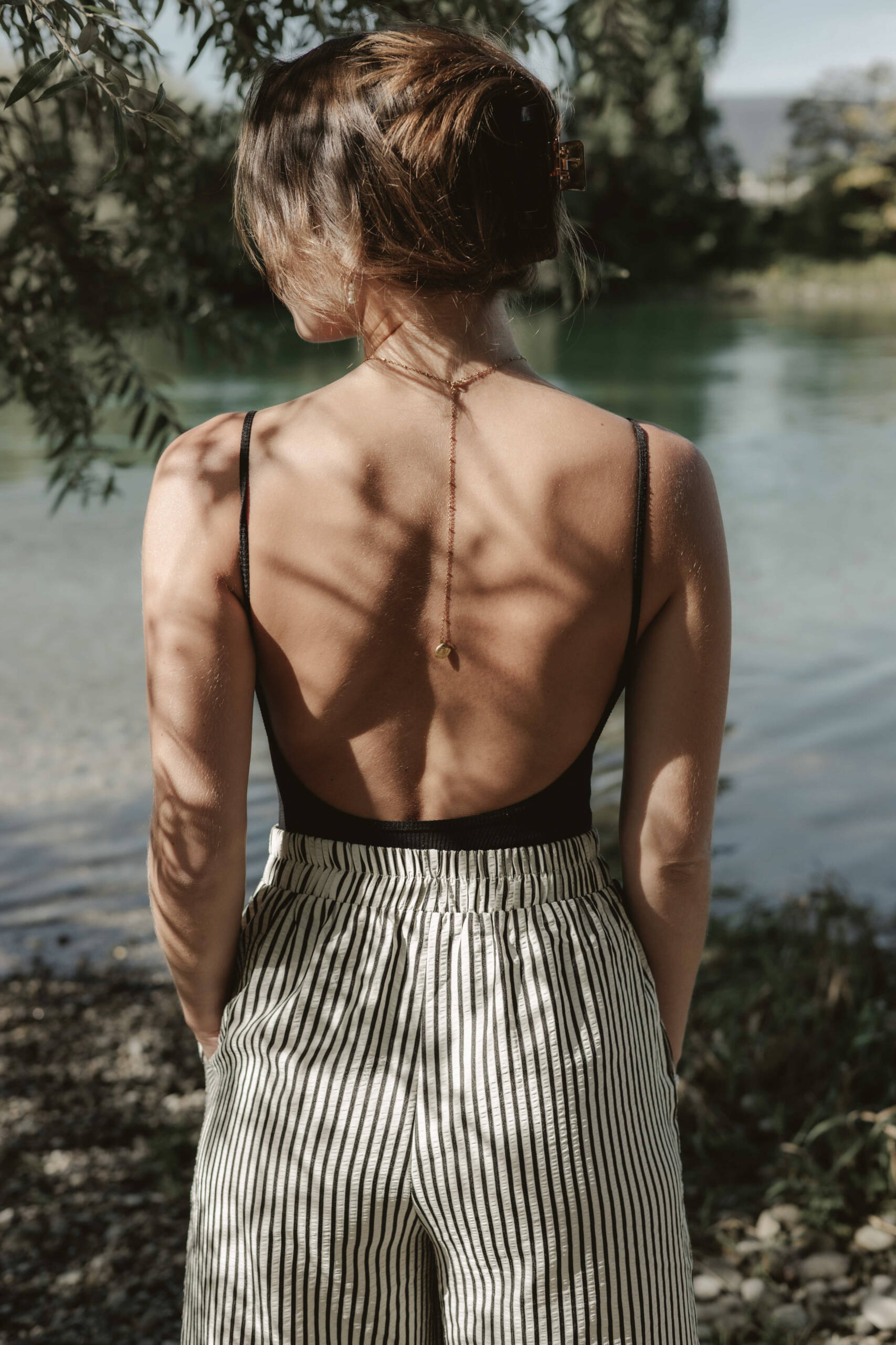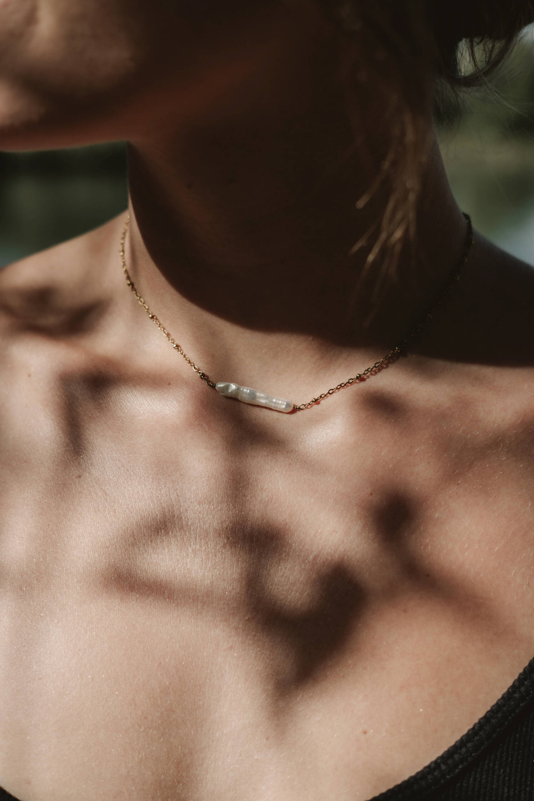 Matériaux : chaîne en acier inoxydable doré (Ion Plating), hypoallergénique, résistant à l’eau et au soleil. Détails : perle naturelle baroque Keshi (chaque perle est unique) + coquillage doré (acier inox.ion plating) en pendentif arrière. Symbolique : féminité fluide, douceur et beauté née de l’imprévu. Longueur ajustable.