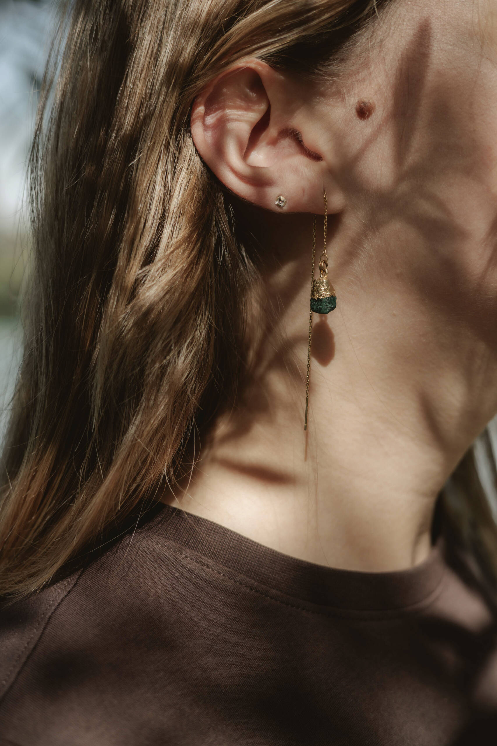 Boucles d’oreilles Émeraude naturelle – Ear Thread. Émeraude vibrante + chaîne dorée fluide = élégance aérienne et puissante. Matériaux : chaîne en acier inoxydable 304 doré (Ion Plating – IP), hypoallergénique, résistant à l’eau et au temps. Pierre : véritable émeraude, symbole d’amour authentique, d’harmonie et de confiance. Atouts : design fin & mobile, léger, qui capte la lumière et accompagne chaque mouvement.