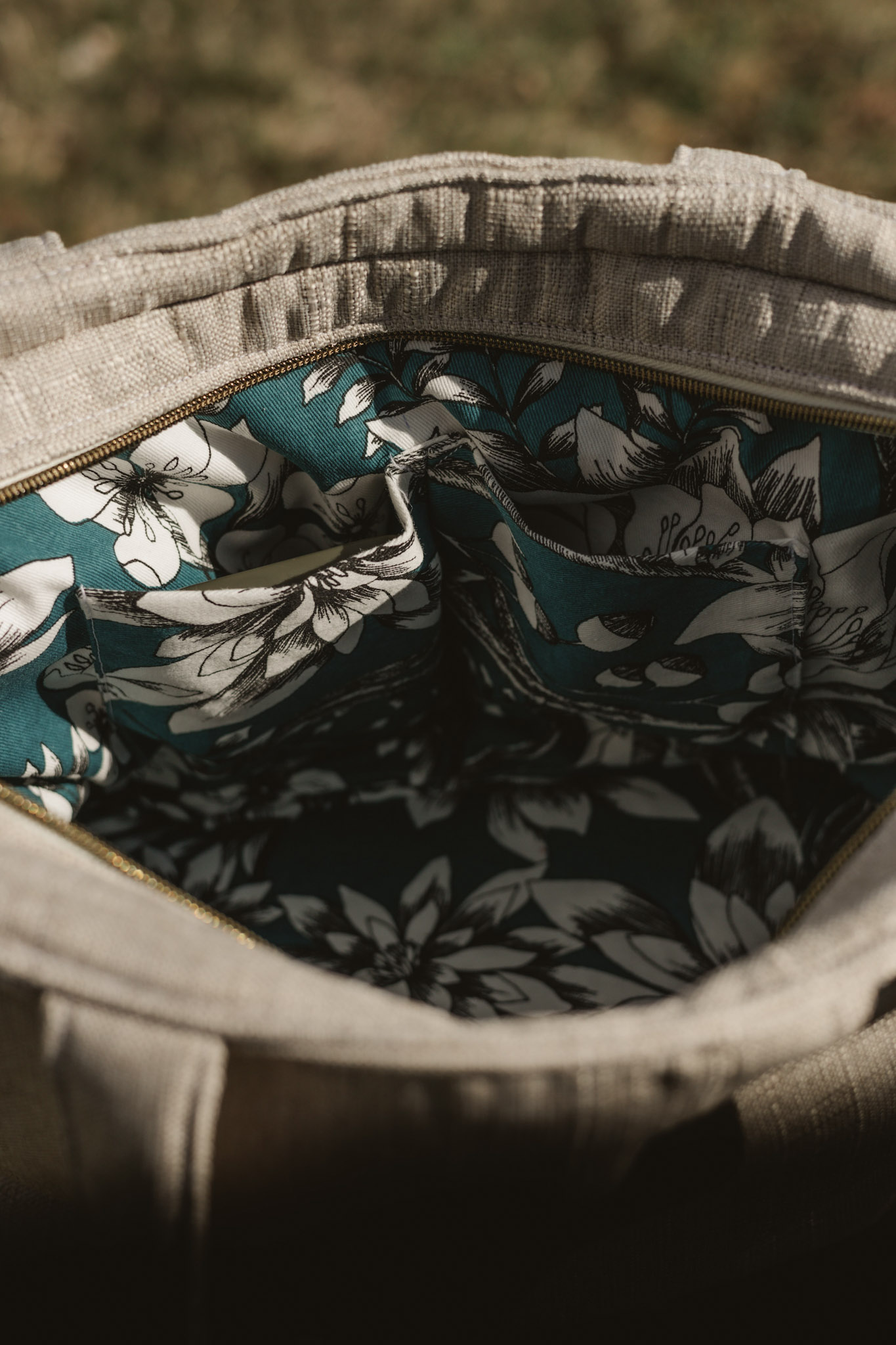 À l’intérieur, une doublure bleu profond aux motifs floraux vient apporter une touche subtile et inattendue. Comme un détail que l’on découvre et que l’on garde pour soi.