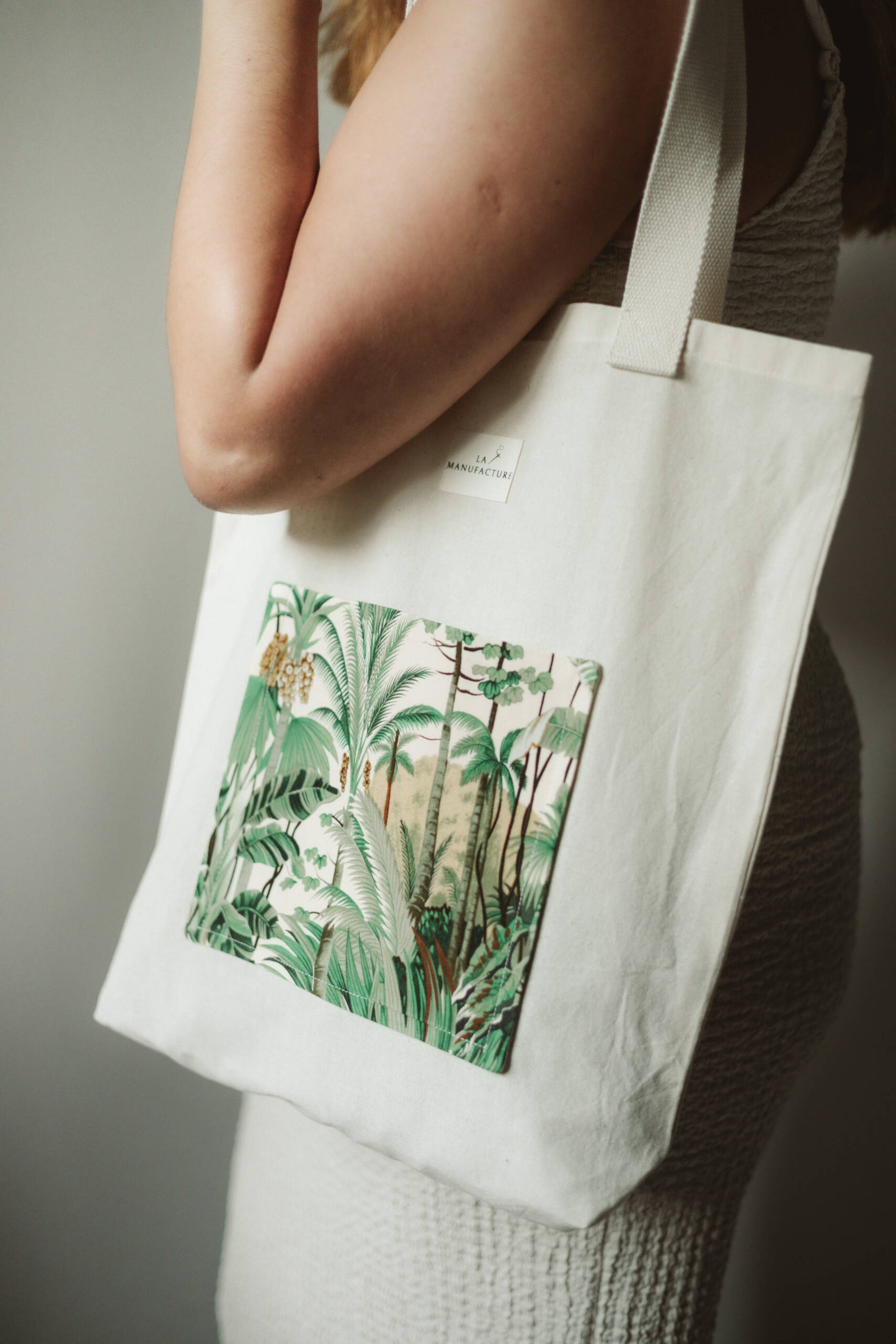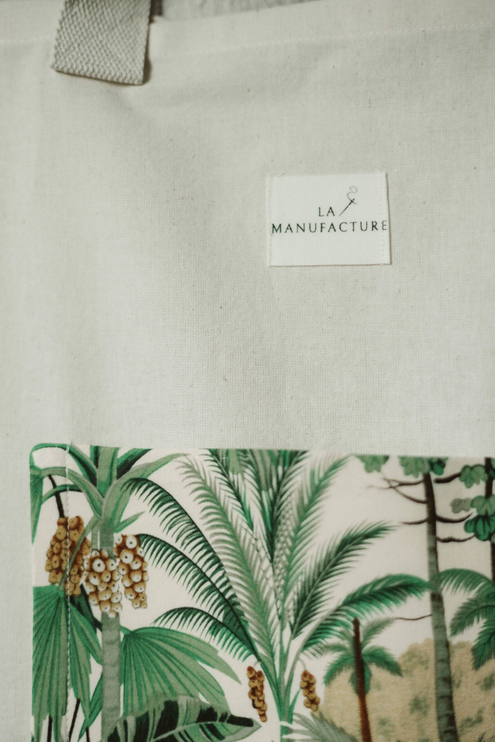 Les tote bags de La Manufacture sont réalisés à la main avec un tissu brut beige neuf, choisi
