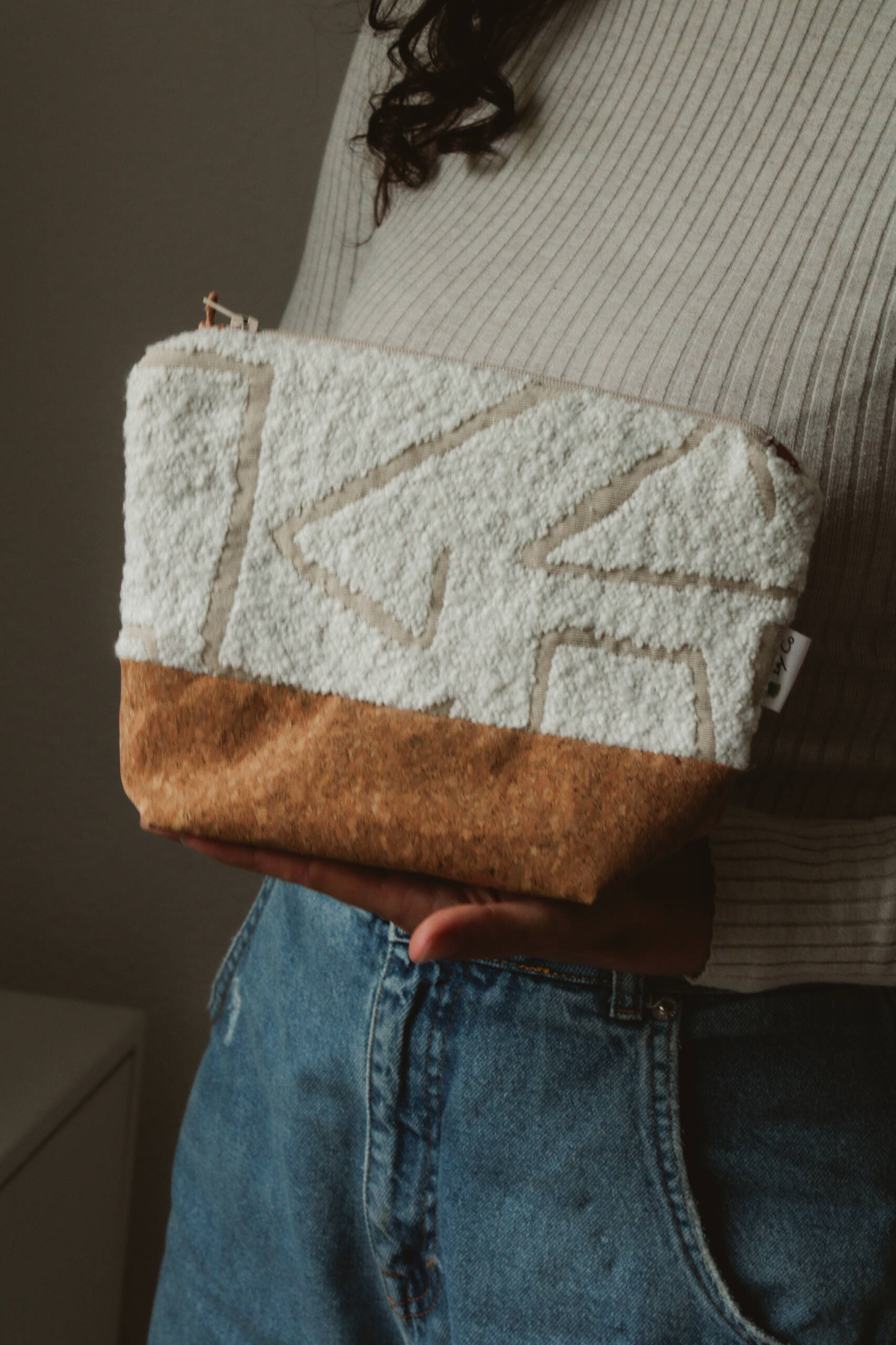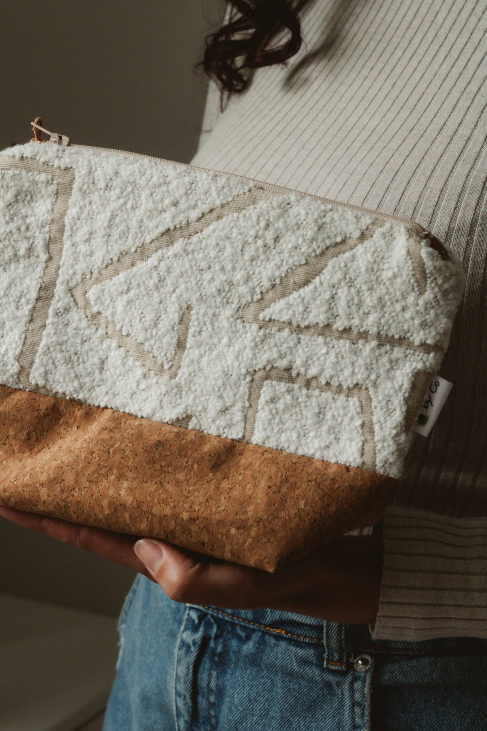 Son mélange de tissu texturé et de liège naturel en fait un accessoire à la fois esthétique et fonctionnel.
